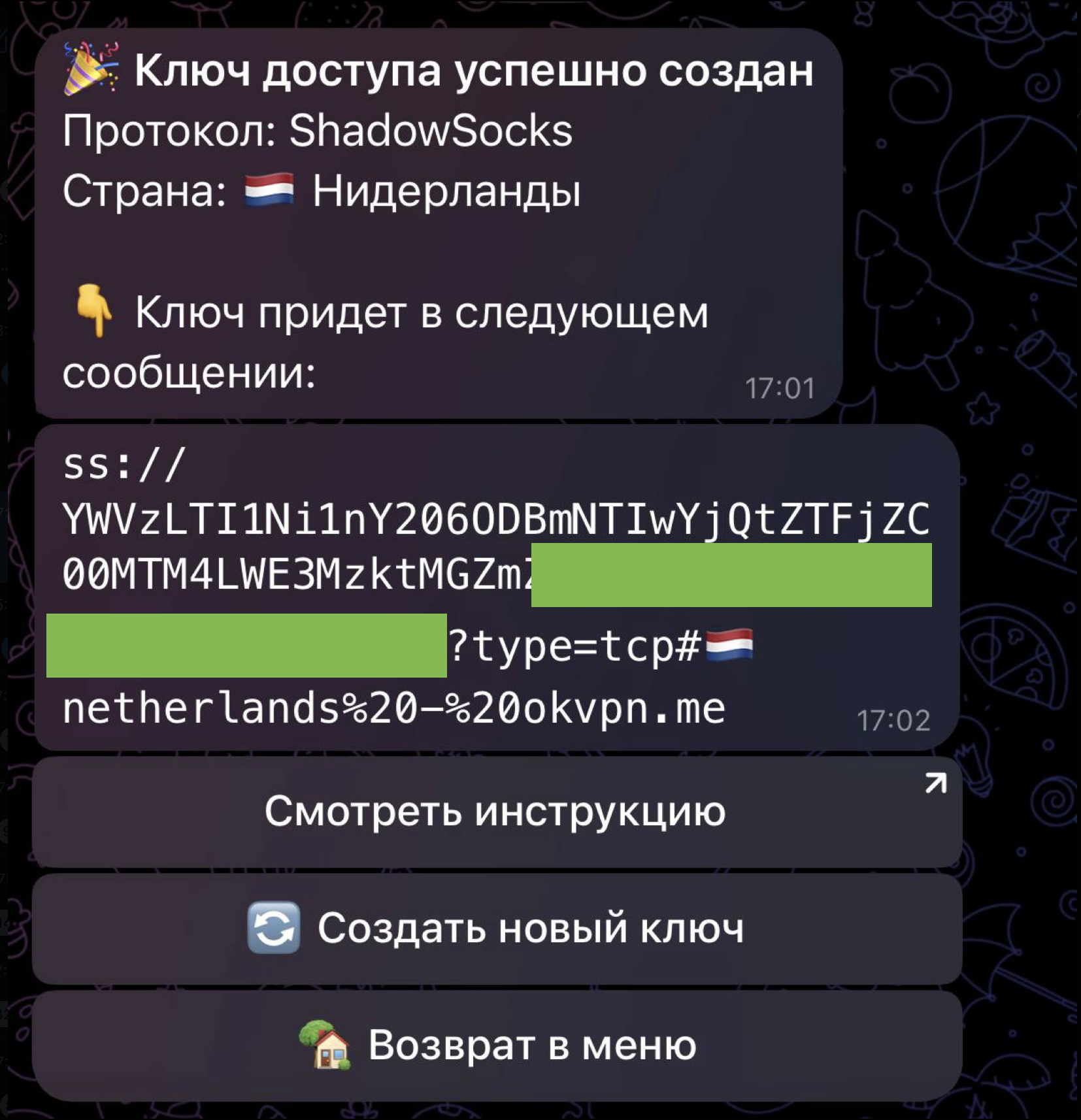 Вам нужен ключ, который выглядит как большая строка со случайными символами и начинается с ss://. Ключ приходит после оплаты, но его всегда можно заново получить, если есть активная подписка на OKVpn